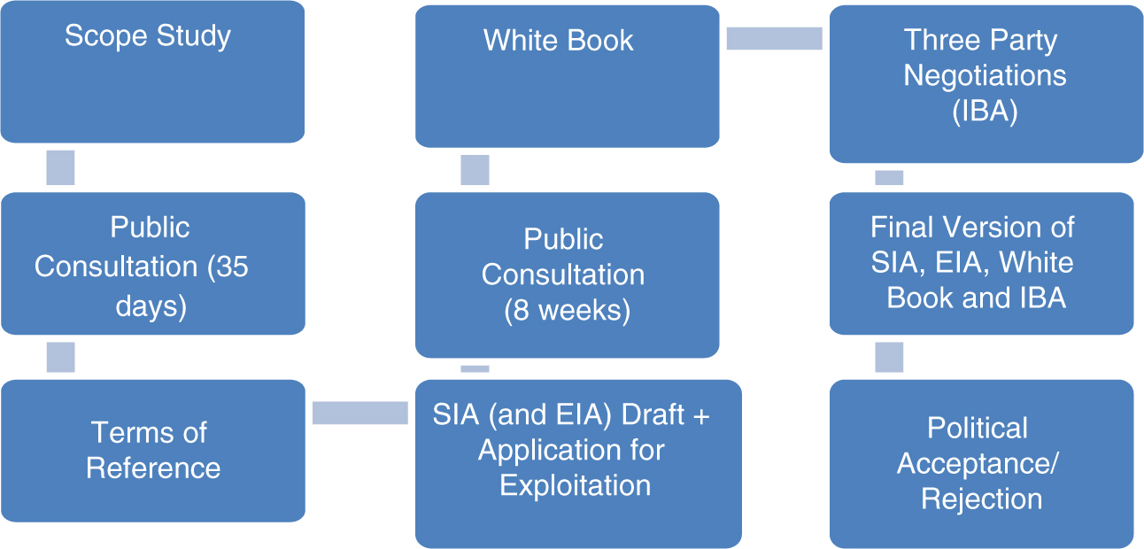 The formal process of public consultation or outlining a Social Impact Assessment is comprised of multiple stages, but is straightforward33: 1) First, there is a scope study, which is a pilot study over the planning and collection of data for the place of the project. During this phase, all relevant stakeholders are informed and should participate regarding the matters to be investigated in such a scope study; 2) after the scope study is completed, there is a 35-day public consultation. During this period, stakeholders can apply for funding to undertake investigations of their own. This new and improved procedure was implemented in 2014. The initiative helps locals, NGOs and associations gather information from neutral sources already at the stage of the scope study; 3) when all information has been gathered and the scope study and the public consultation approved, the next procedure is for the company to write the terms of reference. This terms of reference document is then sent to the authorities for approval. The terms of reference is a more detailed document and can be seen as a committee report. This document is not submitted for a public hearing; 4) a draft for an SIA and an EIA is the next step in the process, if the project is considered to have a significant impact on society. During this stage the document(s) constitute the basis of the next public consultation. The public hearings span 8 weeks. The form these public consultation meetings take can vary, and can include: stakeholder meetings, local meetings with citizens, public hearings and/or information meetings; 5) the White Book is then written. The purpose of the White Book is to address relevant concerns raised during the public consultation meetings. All of the concerns raised should be included in this document; 6) the next step is the three-party negotiations regarding the Impact Benefit Agreement (IBA). This is the agreement between the authorities (municipality and the government) and the company. The IBA is published after it is approved34; 7) after all these stages, and if the project has been successfully outlined in each phase, the final version of the White Book together with the final versions of SIA and EIA are sent to the government for political approval. The Government of Greenland will then either accept or reject the proposal for exploitation.35