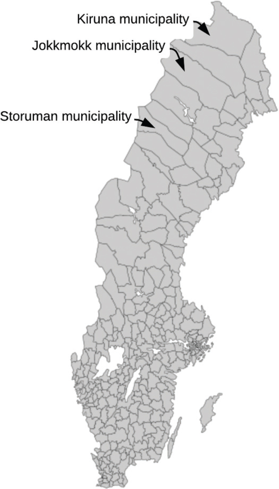 The Swedish case comprises data from three municipalities in northern Sweden where mining development is currently ongoing: Jokkmokk and Kiruna municipalities in the county of Norrbotten, as well as Storuman municipality in the county of Västerbotten. Overall, Sweden has a long-standing history of mining and metal refining, stretching back more than a thousand years. Today, Sweden is by far the largest iron ore producer in the EU, and is also among the foremost producers of base and precious metals. In absolute terms, the mining and minerals industry supplies export products with an annual value of just over EUR 17.5 billion. In 2013, the industry’s share of Swedish GDP amounted to 1.3 percent, not accounting for the vast indirect economic effects of the mining and minerals industry.33